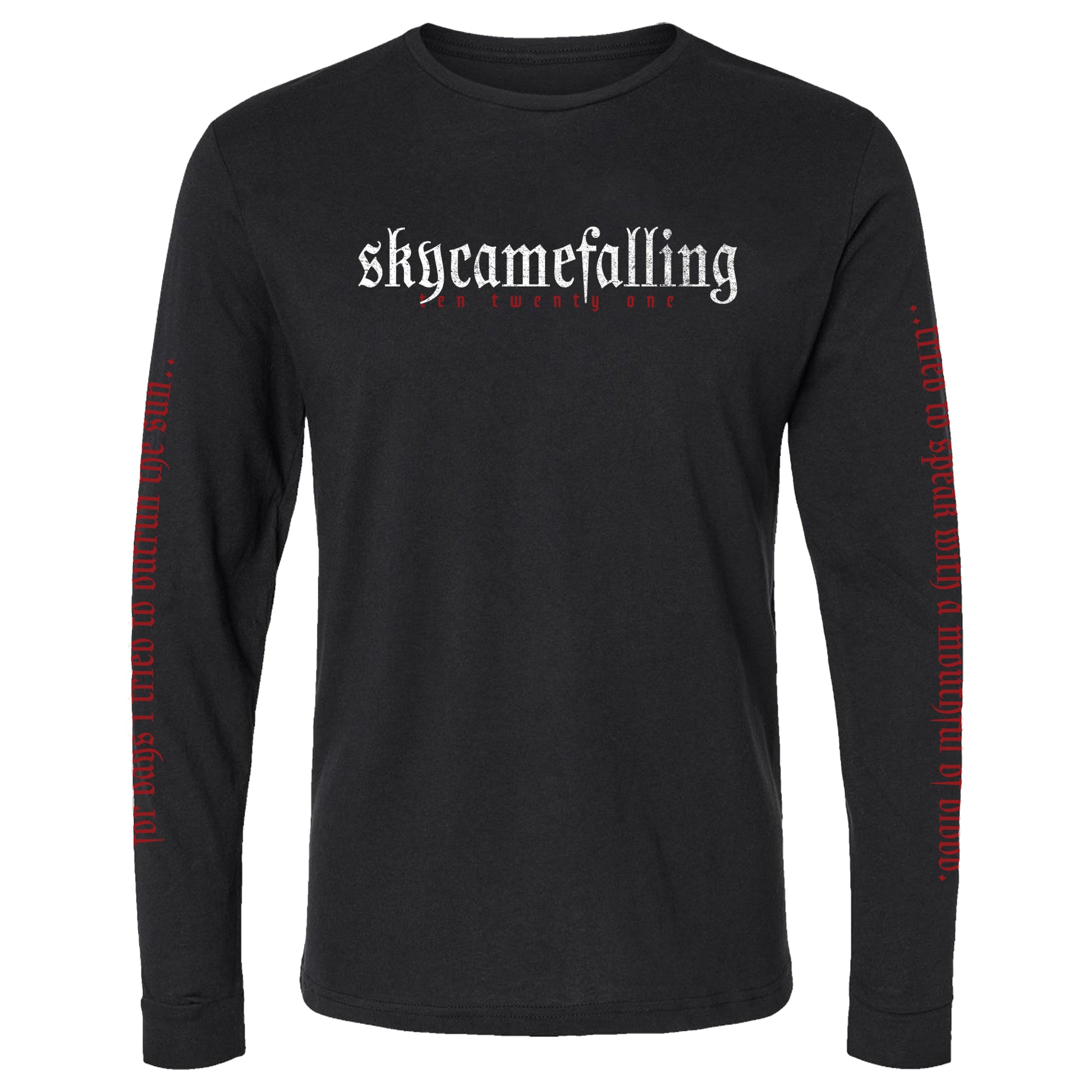 Printed on a Black Comfort Colors Long Sleeve Shirt. Designed by Drew Kassl. Photo by Kevin Obryant. Sleeve print has the lines "For days I tried to outrun the sun..." & "...Tried to speak with a mouth full of blood"